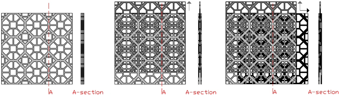 Schematic drawing of the shading system – the geometrical pattern concept and layer movements in three configuration: