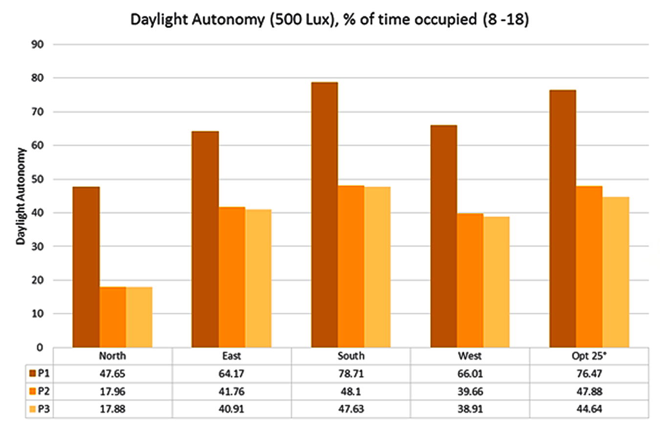 Daylight Autonomy as function of three patterns and for the four main orientations as well as optimum orientation