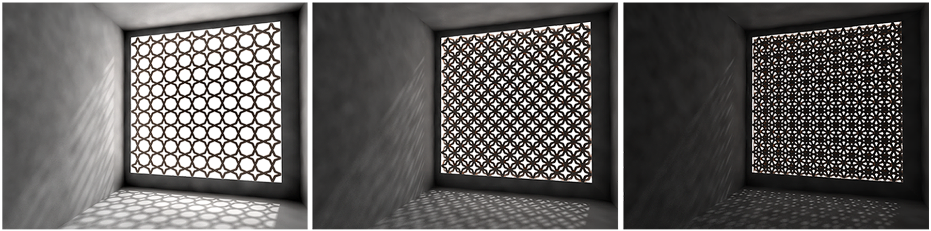 • Mashrabiya pattern opening ratio: max > 0.45, min < 0.15