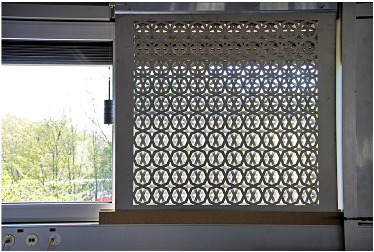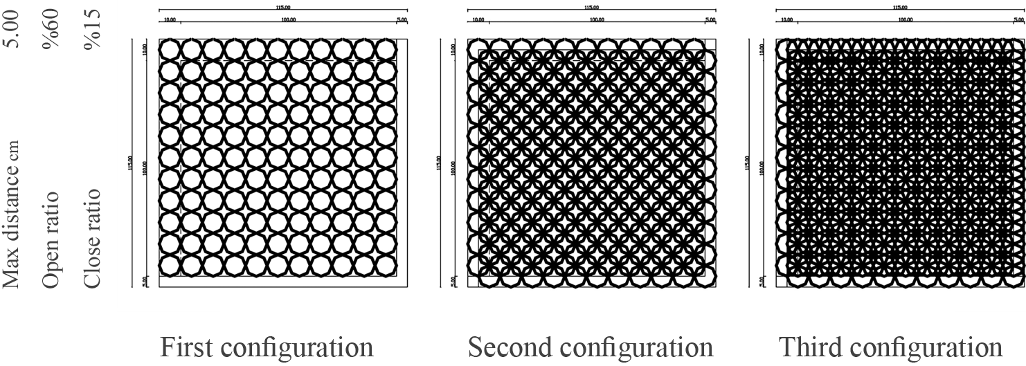 I designed different models by simultaneously taking into consideration how they would look like after layer movements. Thus, the combination of direction, the magnitude of movements and the pattern of each layer can influence the appearance of the final product. Besides the aesthetic aspects, another important parameter, was the opening ratio of the window in different configurations. These opening ratios must be compatible with generally agreed upon standards. To evaluate my design in this respect, I used a MATLAB code to process my designs. At the end, geometrical modifications and manipulations were applied to the models and finally considering all the parameters some designs got selected.