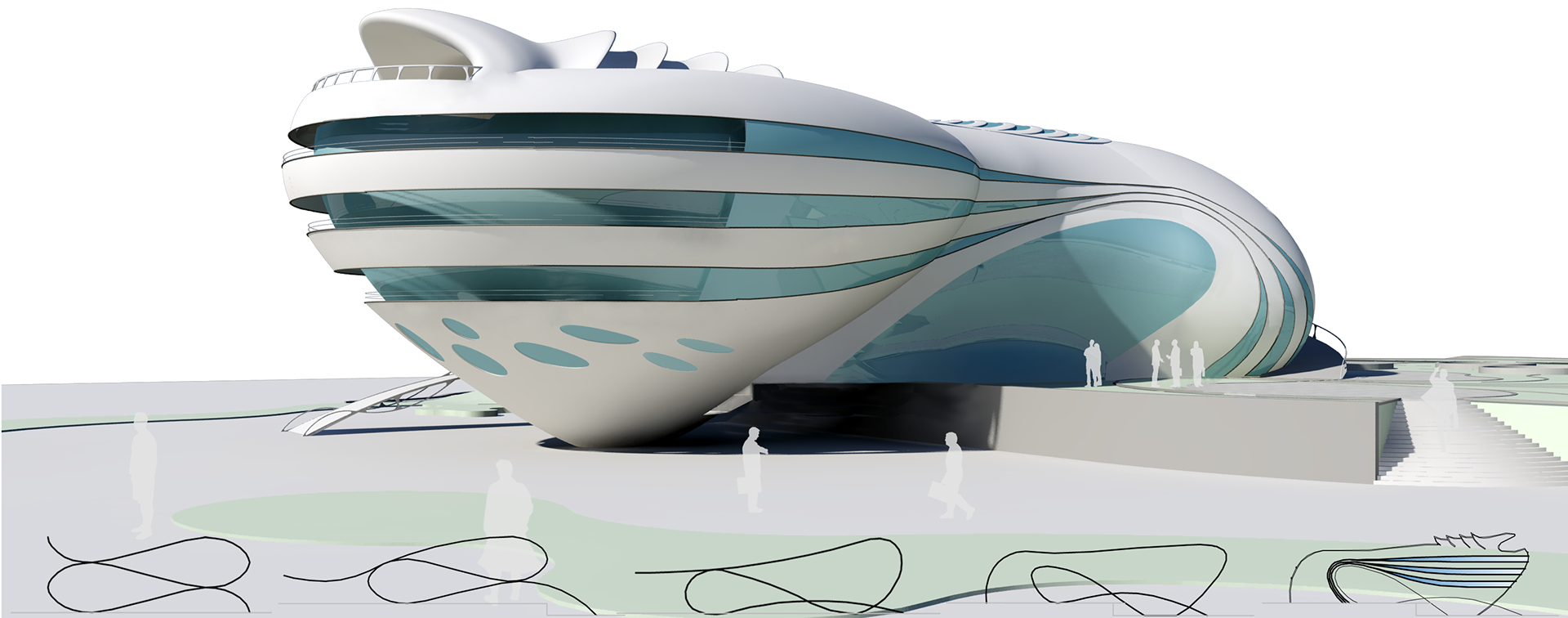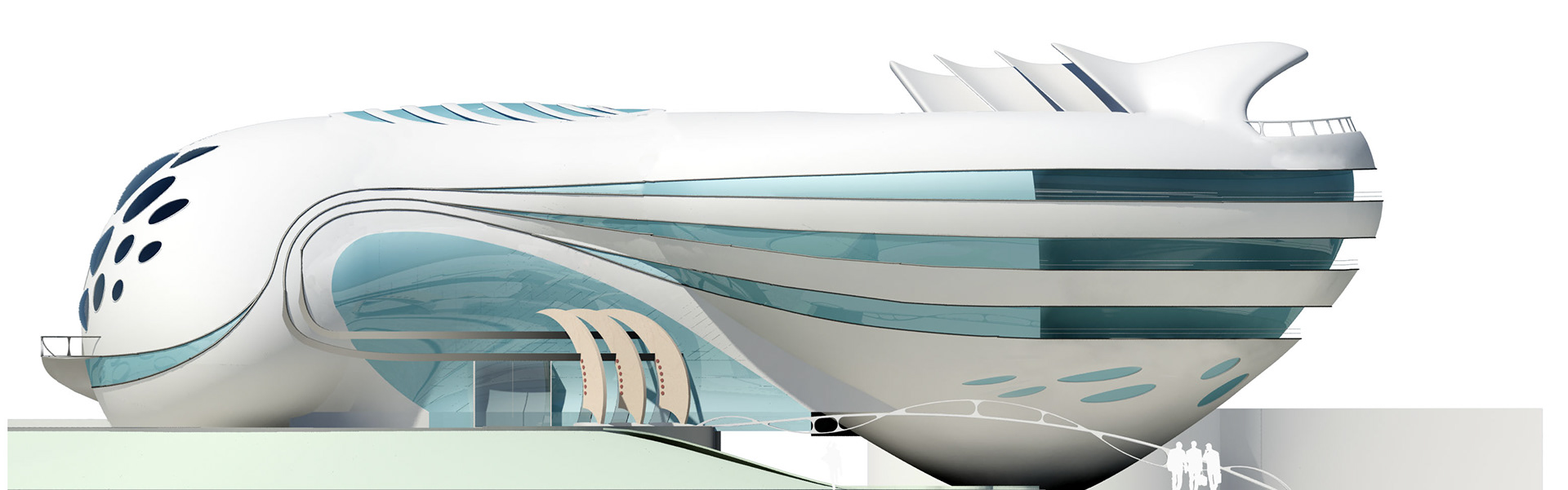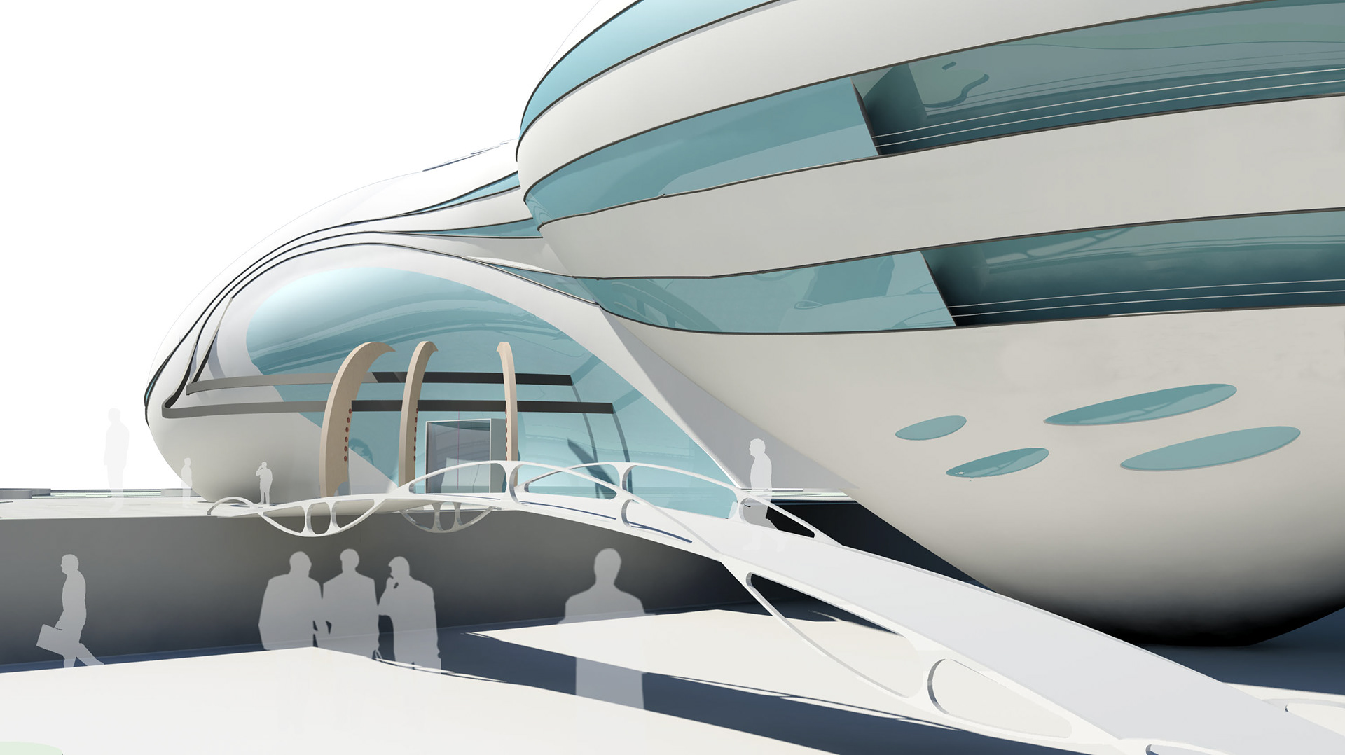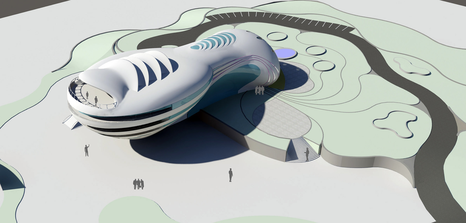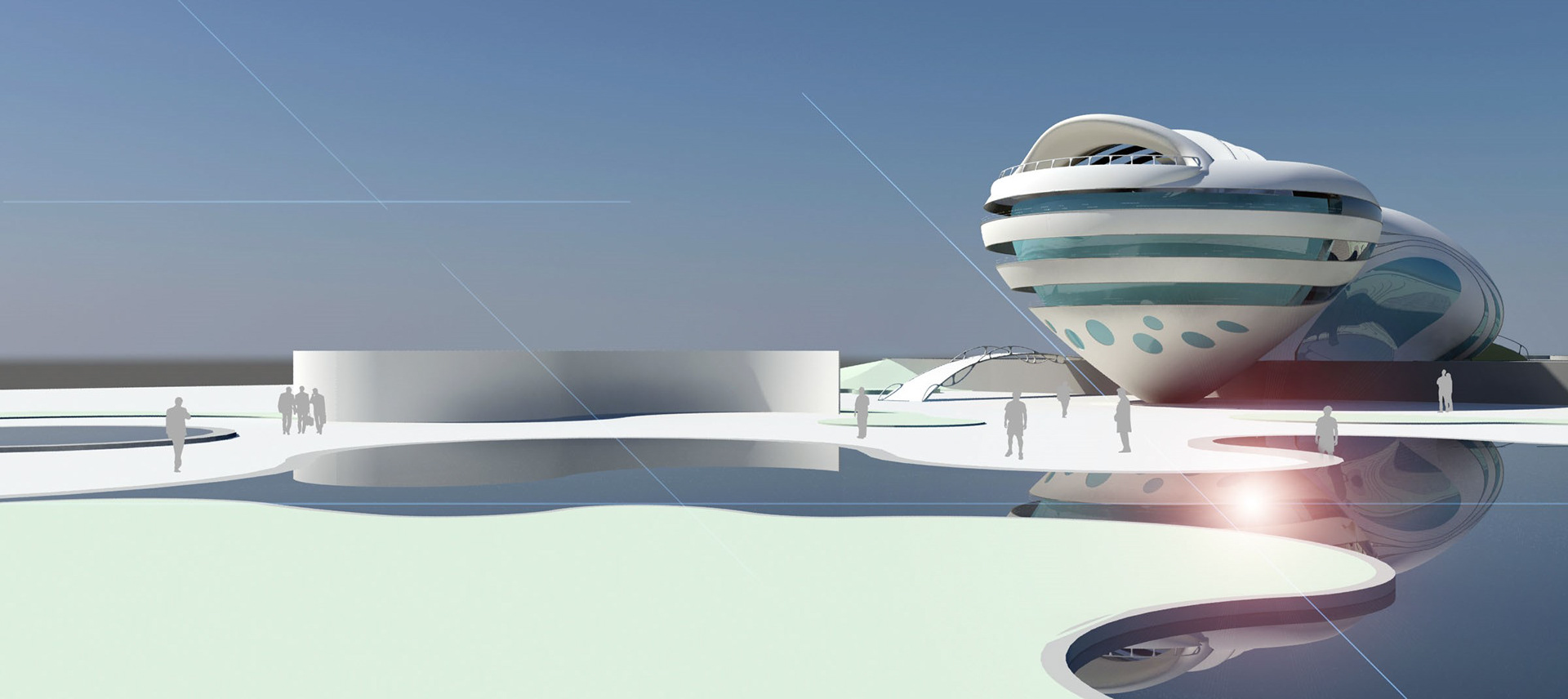 Since the project is coastal with hot and humid weather and the dominant wind blowing from Persian Gulf, volumes are shaped aerodynamically in which the air can be ducted easily and cause the least wind friction. Also, the light reflection reduction and creating twilight on curved planes that absorb less sun heat energy are considered.