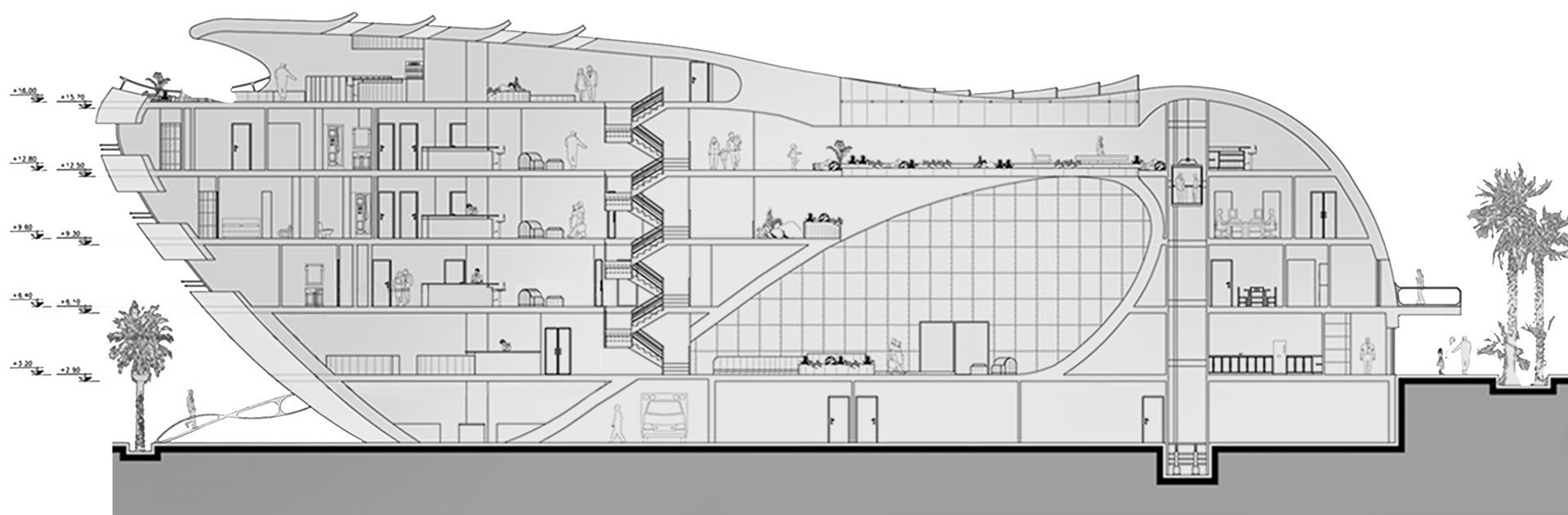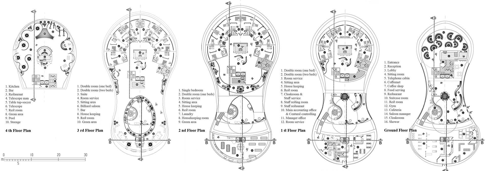 The hotel building is divided to residential and service areas. The residential area is in the south side of the building looking over the sea including rooms, room services and restaurant. The service area is in the north side with employee sections, housekeeping and other service parts, fitness salon and billiard room. Central atrium is situated between these areas and includes hotel lobby and reception desk.