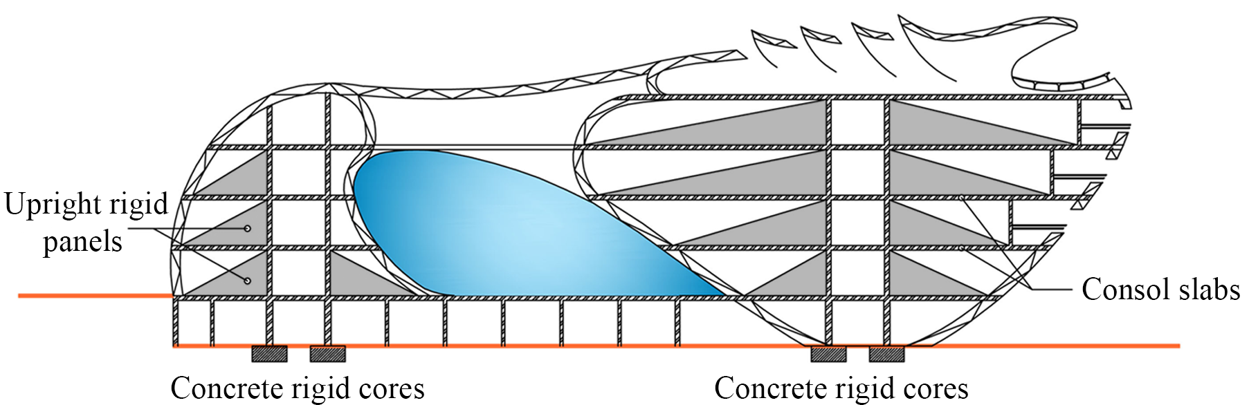 Super frame system is used in the structure, i.e. 2 concrete rigid cores with console slabs and the combination of upright rigid panels. Also, building shell is double hulled so firstly, some of the building utility passes through and secondly, there are wind-catch elements between the shells that create tension.