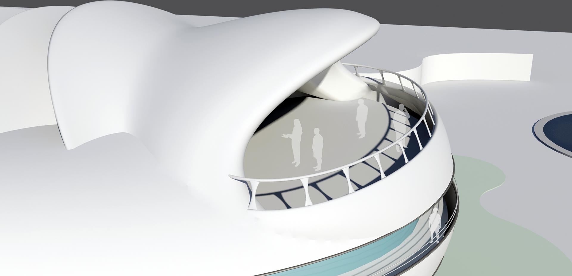 To use the optimal cool blowing of coastal wind which is predominant in the island, I designed a roof terrace inspired by the form of manta ray mouth shape when hunting. Not to mention, the air suction system of traditional Wind Catchers in hot regions of Iran are utilized in mechanism respectively. The pleasant cool coastal wind is sucked into the terrace and exits from gill like slots (grooves) fixed on the ceiling and some parts of walls. The air flow passing the slots automatically creates suction and increase in wind speed. Also, visitors can enjoy other nice sceneries specifically the view of Persian Gulf sky at night time.
